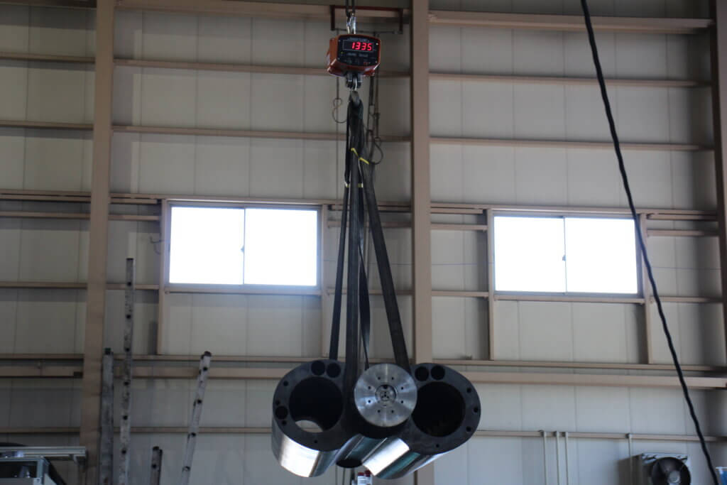 動バランス調整を行う対象物は、事前に直径と重量を測定しておかなければなりません。今回測定を行うインペラも同様にこれらの事前測定を行います。重量の測定はクレーンスケールを利用して行い、直径の測定は図面を正としますが、図面が手に入らない場合には実測により行います。