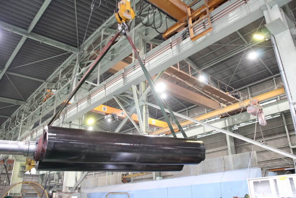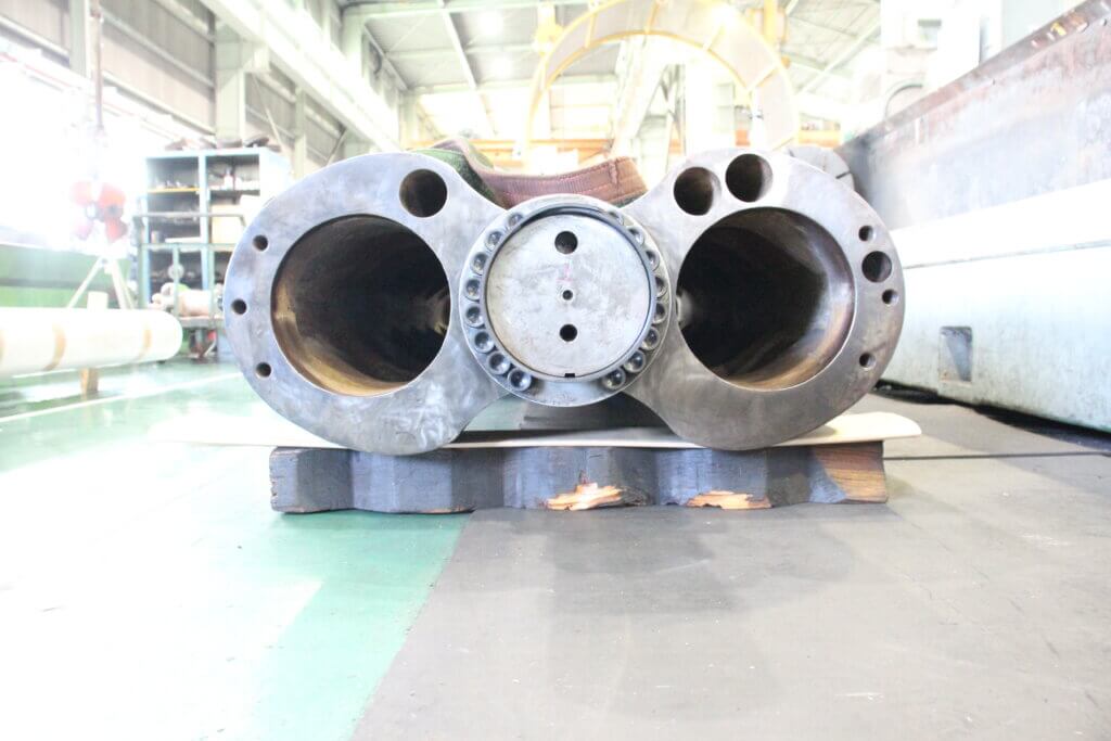 動バランス調整とは高速回転する物体のアンバランス量を極力少なくする行為です。このアンバランス量は組立時の芯のずれ、摩耗やひずみによる変形、材料の不均一など多くの外的要因に影響された結果となります。今回は国内最大、最長で重量級となる2翼インペラの動バランス修正を実施しました。