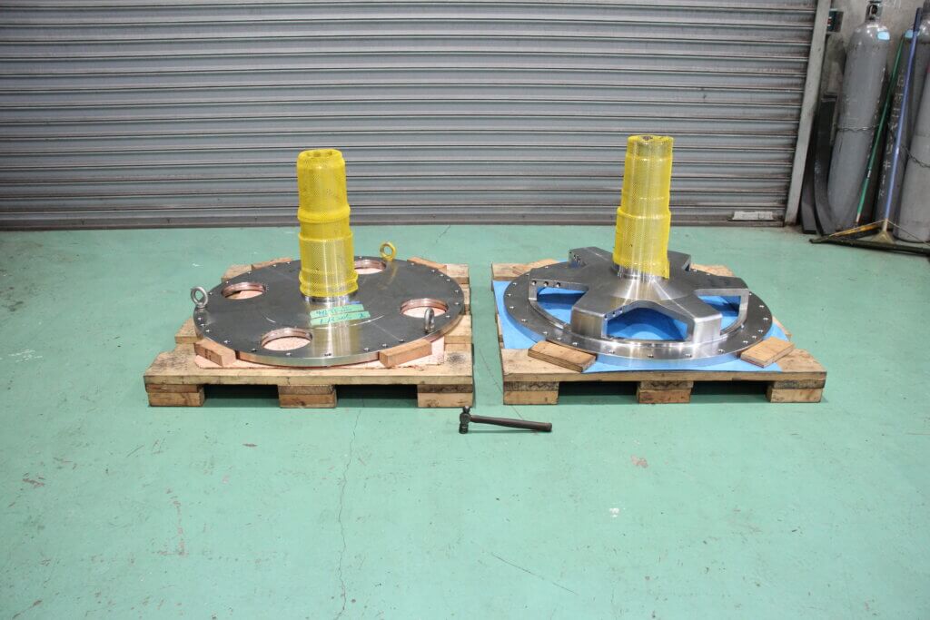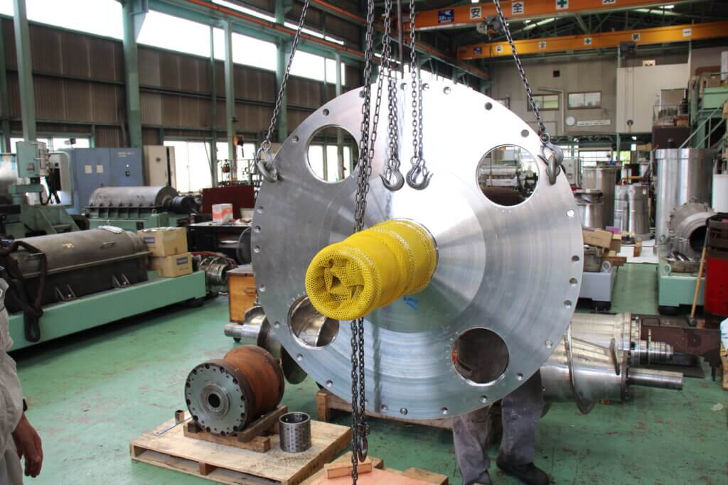 今回製作を行った軸付フランジは大型部品のため鋳造により大まかな形を鋳込みその後機械加工により仕上げています。大型の機械部品は強度や形状の観点から溶接構造ではなく鋳込みを優先すべきです。特に遠心分離機の部品は高速回転と処理物から由来するねじりトルクを受ける部品は強度を最優先にしなければなりません。