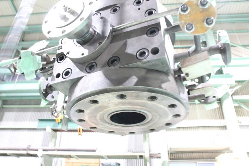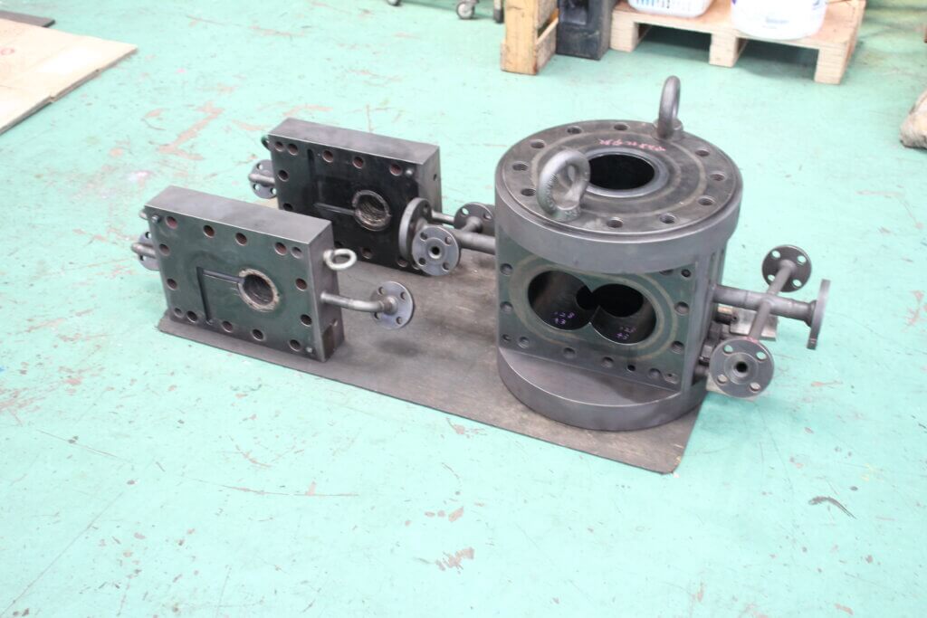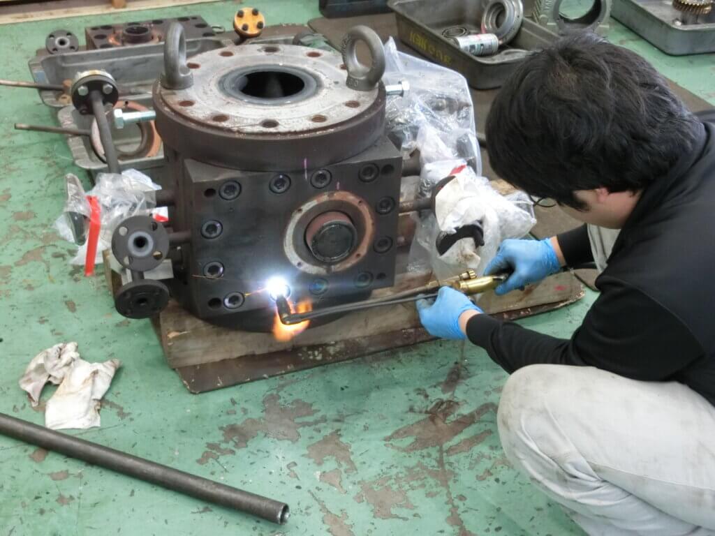 ギアポンプは溶解した樹脂を定量的に送り出す機能があります。溶解した樹脂はポンプ自身が昇温されその粘度を維持しますが、整備のために取り外されるとポンプ自体が冷えてしまい中の樹脂が内部で固着します。今回のギアポンプもこれまで整備を行ってきたギアポンプと同様に内部で樹脂が固着していたため分解に苦慮しました。