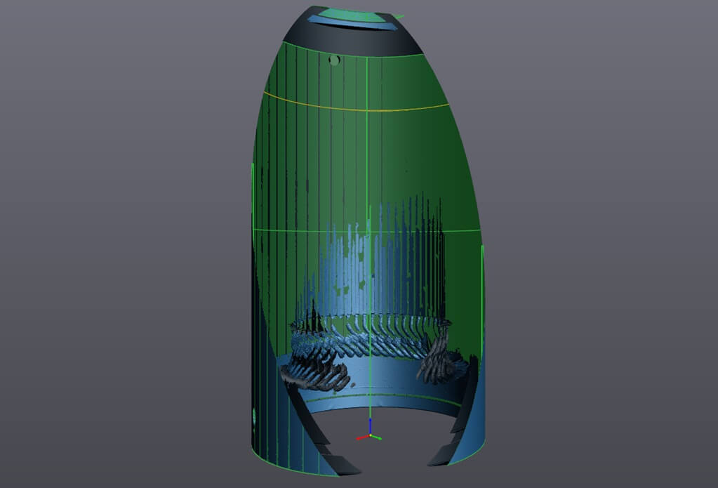 今回のモータの部品を全てスキャンするにはおおよそ1日は必要となります。今回の上部、下部ブラケットのスキャンは難しくはありませんでしたが、モーターケースは筒状の形状のため、円筒部分や下面のスキャンはそれほど難しくはありませんでしたが、吊り上げの際に必要となる治具があるため、この治具に3次元スキャン時のレーザー光線が当たらないように注意しながらスキャンを行います。