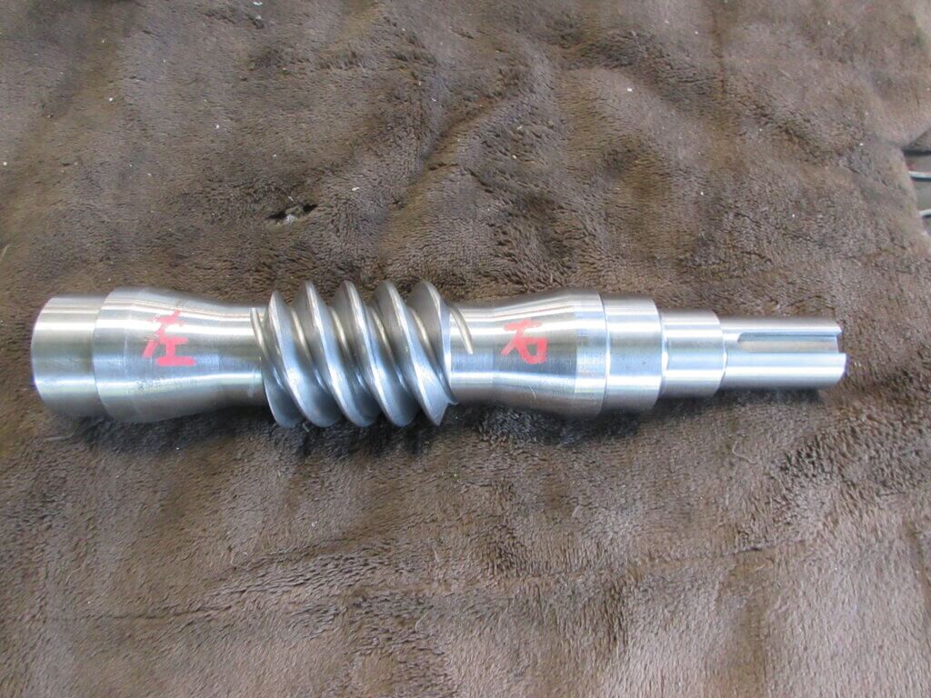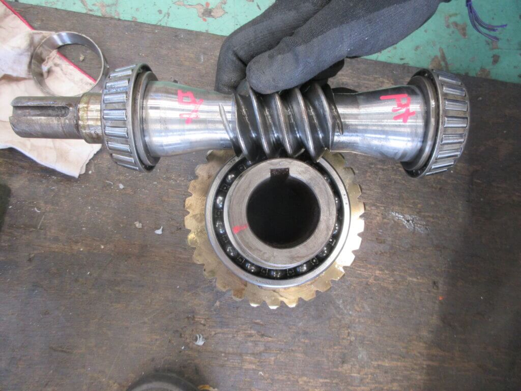 ウォームとウォームホイルにより、直行で駆動するための減速機となっていました。それとなく見たときは、過去にも同じような整備を行ったヘリカルの歯車かと思いましたが、軸の位置をよく見れば違うようです